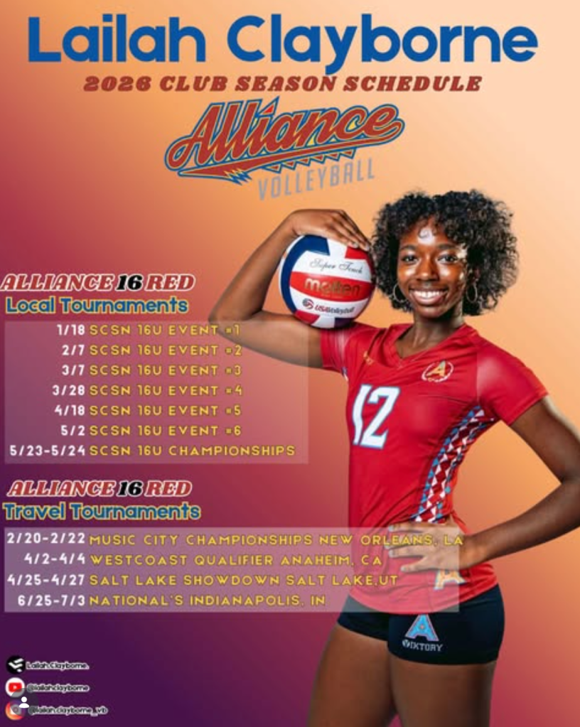 Hi! My name is Lailah Clayborne. When I play volleyball, I try to play with confidence and aggression- constantly trying to be there for my team and put the ball away. I find the open spots on the court and I take the game very seriously.